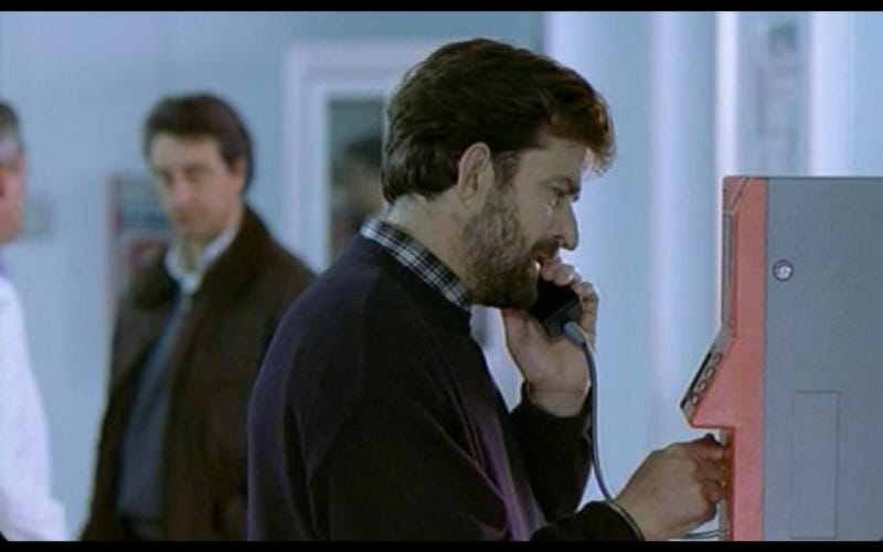 Ahora están en el hospital y Giovanni dice a su mujer que va a hacer algunas llamadas. Llama, lo atiende otro contestador automático. Intenta avisar a alguien lo que ha pasado, pero no puede.