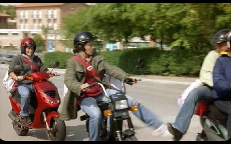 La hija, Irene, va en moto por una ruta de pueblo. Alguien tira de su mochila con la moto en movimiento. Irene también se asusta, pero enseguida reconoce a los de la otra moto. Sonríe. Era una broma, pero la tensión no termina. Juegan a darse patadas, a desestabilizar la moto del otro mientras conducen.